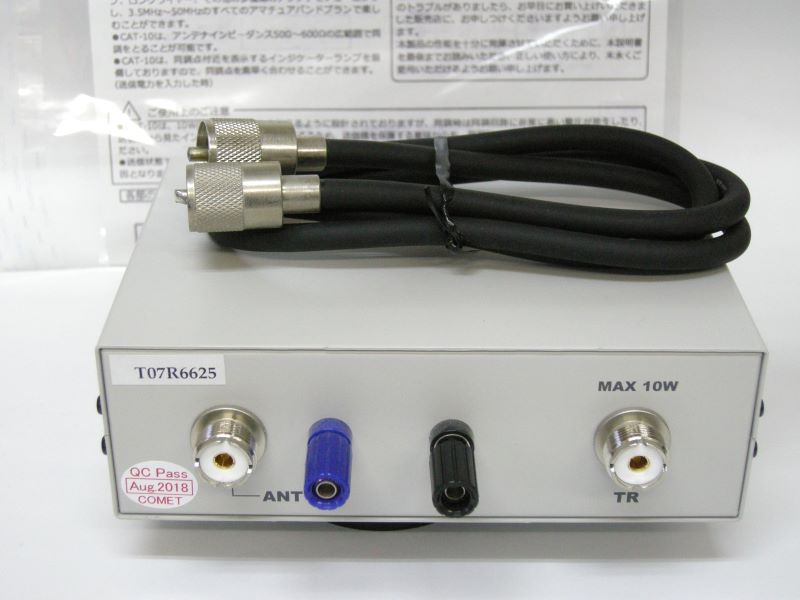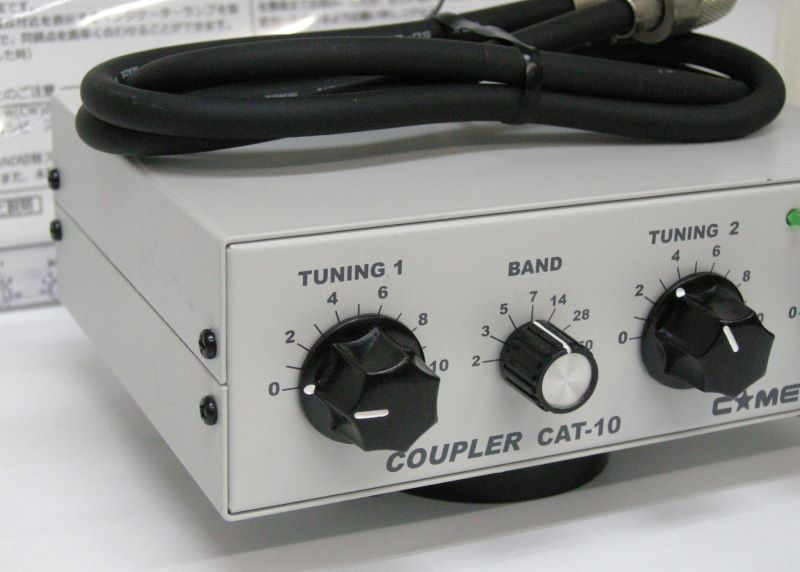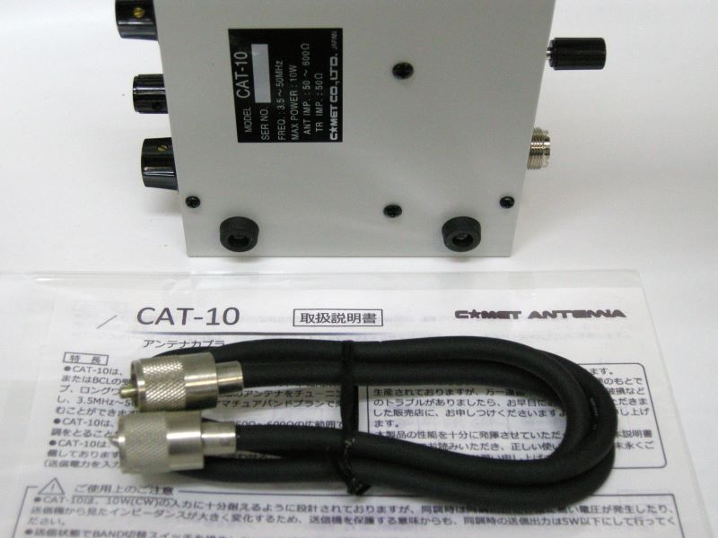 商品名= アンテナチューナー、 型式= CAT-10、メーカー= COMET 対応バンド=3.5~50Mhz帯、QRP10w用 サイズ=162(W)、100(H)58(D)120(w)mm、重量:900g 付属品= 同軸ケーブル5D2V:80cm、コピーの取説があります。 動作状態= 点検済み、おおむね良好です。 外観状態= ちいさスリキズがありますが状態は良いです。