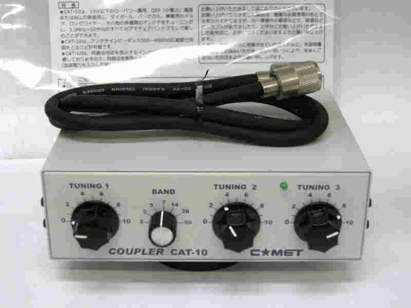商品名= アンテナチューナー、 型式= CAT-10、メーカー= COMET 対応バンド=3.5~50Mhz帯、QRP10w用 サイズ=162(W)、100(H)58(D)120(w)mm、重量:900g 付属品= 同軸ケーブル5D2V:80cm、コピーの取説があります。 動作状態= 点検済み、おおむね良好です。 外観状態= ちいさスリキズがありますが状態は良いです。